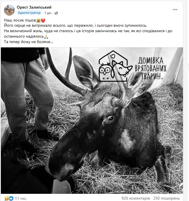 Серце лося не витримало всього, що йому довелося пережити. У ніч на 4 жовтня воно зупинилося. Про це повідомив керівник притулку Орест Залипський.