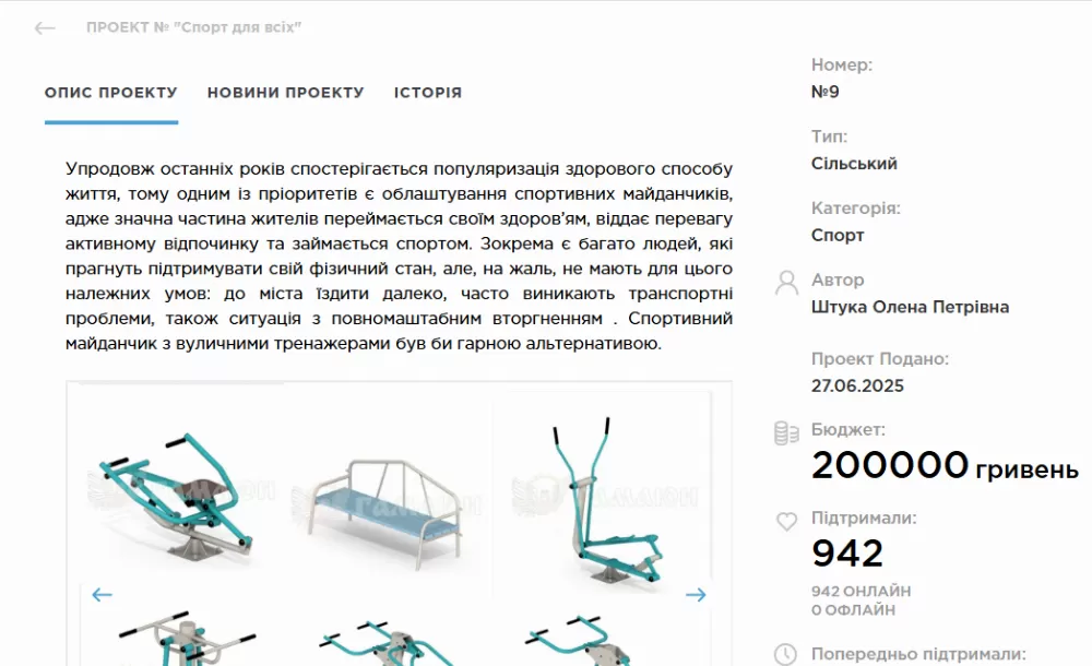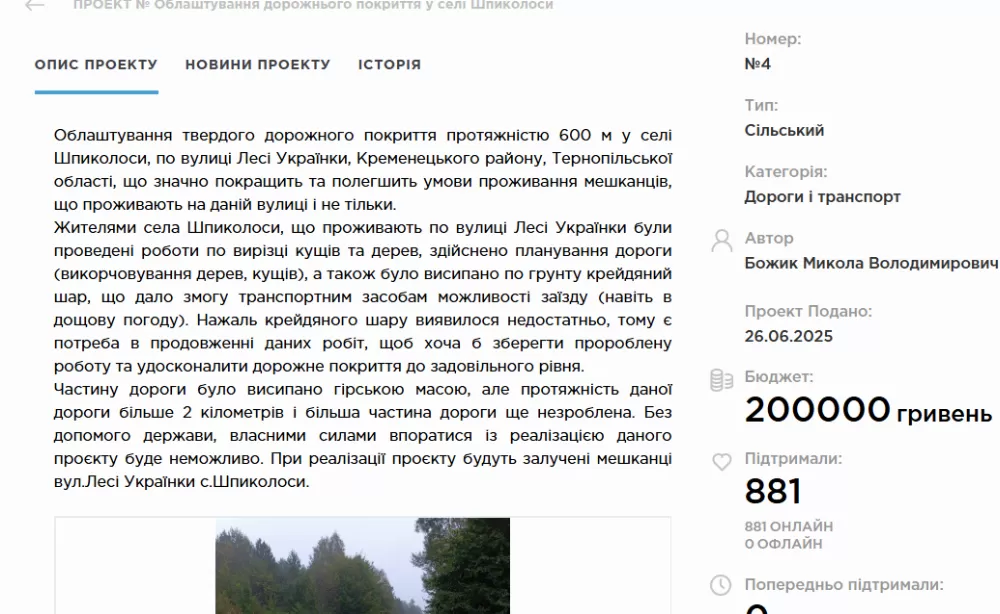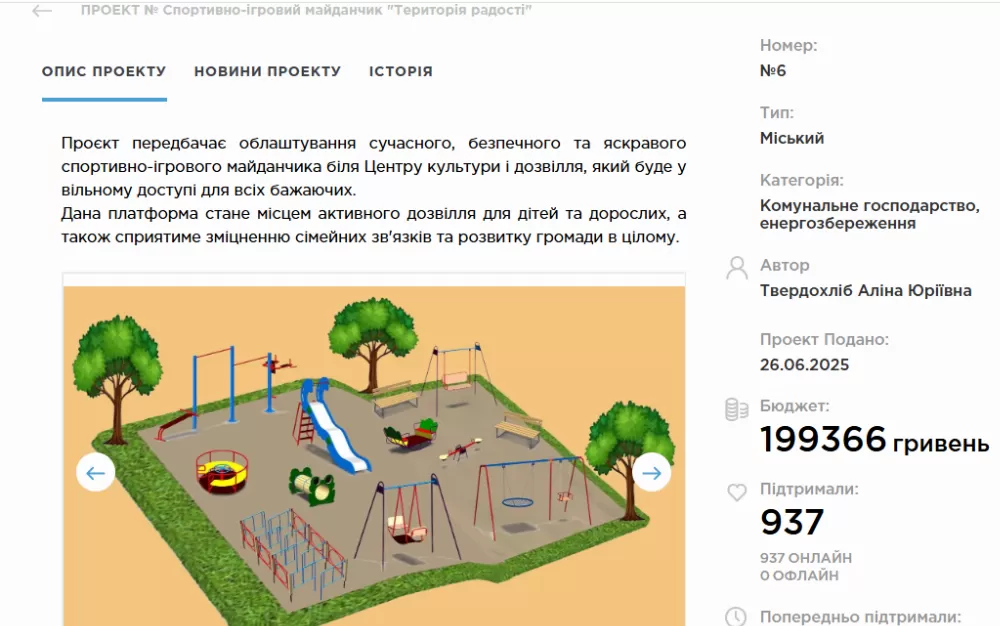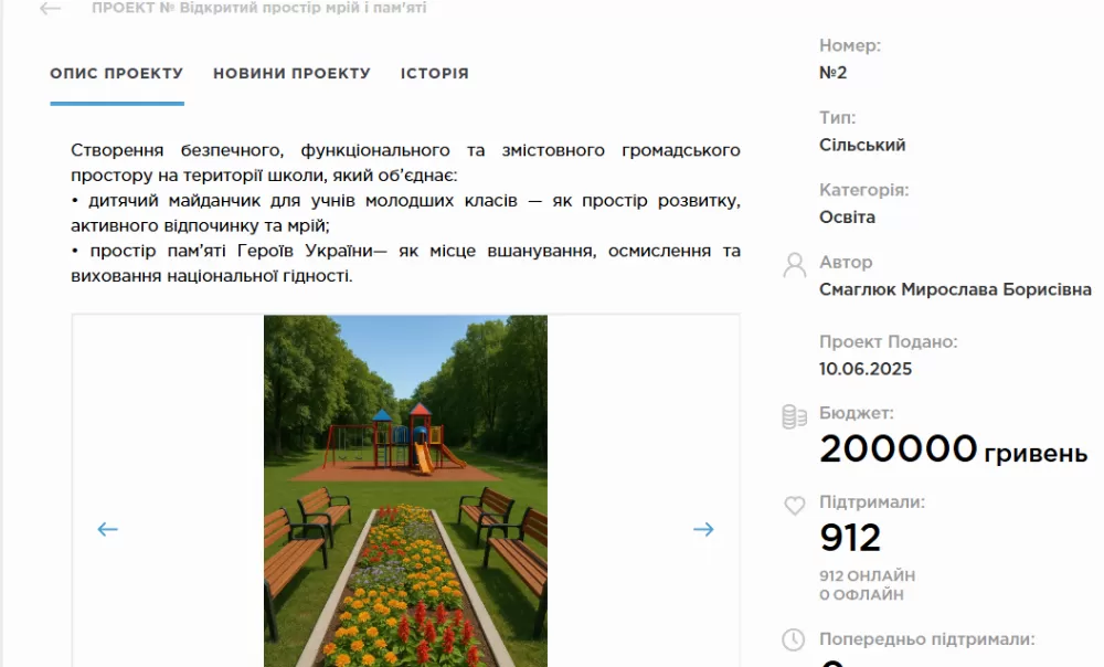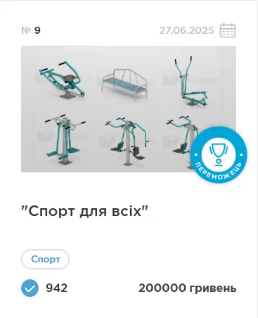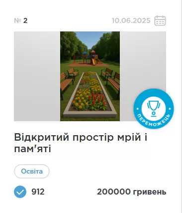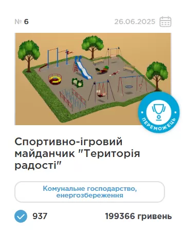 На Кременеччині оголосили результати конкурсу проєктів Громадського бюджету Кременецької міської територіальної громади 2026. 25 вересня 2025 року завершилося електронне голосування за проєкти Бюджету участі Кремінської міської територіальної громади, які планують реалізувати у 2026 році. Голосування тривало з 5 по 25 вересня на платформі електронної демократії EDEM. Загалом на конкурс до міської ради надійшло 12 проєктів, проте комісія допустила до фінального голосування 10 із них. Про це повідомив голова Кременецької міської громади Андрій Смаглюк. Читайте також: Історичні пам'ятки без "павутини": у Чорткові планують масштабний проєкт "Переможцями стали 4 проєкти: "Спорт для всіх" (село Сапанів - 942 голоси); спортивно-ігровий майданчик «Територія радості» (місто Кременець - 937 голосів); відкритий простір мрій і пам'яті (село Дунаїв - 912 голосів); облаштування дорожнього покриття у селі Шпиколоси (село Шпиколоси - 881голос)", - йдеться у повідомленні.