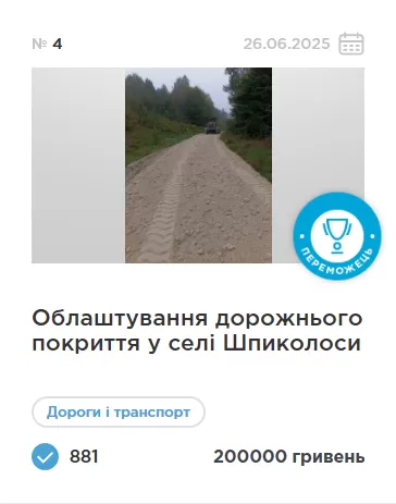 “Переможцями стали 4 проєкти: “Спорт для всіх” (село Сапанів – 942 голоси); спортивно-ігровий майданчик «Територія радості» (місто Кременець – 937 голосів); відкритий простір мрій і пам’яті (село Дунаїв – 912 голосів); облаштування дорожнього покриття у селі Шпиколоси (село Шпиколоси – 881голос)”, – йдеться у повідомленні.