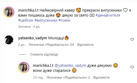 Успіх не залишився непоміченим. Диригент хору «Гомін» Вадим Яценко поставив лайк і написав схвальний коментар “Молодці”!