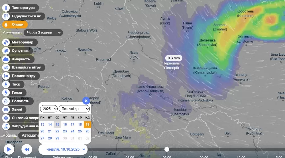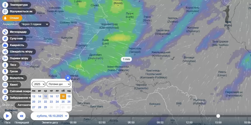 У суботу, 18 жовтня, буде хмарно. Температура складатиме від 7 градусів вночі до 14 градусів вдень. Проте у неділю, 19 жовтня, знову похолодає – вночі термометр показуватиме лише +3, вдень – не більше ніж +6. Йтиме дрібний дощ. Більше – у скриншотах погоди та картах погодних радарів.