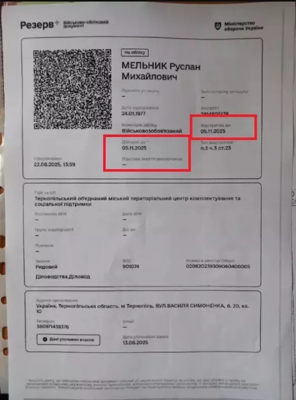 Видання “20 хвилин” отримало від рідних та адвокатки документи, які підтверджують, що Руслан Мельник справді є чинним вчителем у школі. В редакції є копія з “Резерв+”, де вказана відстрочка до 5 листопада. У ній немає жодних згадок про розшук і порушення, пов’язані із військово-обліковими документами.