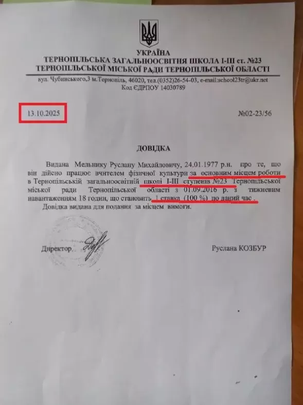 “У нашій школі є людина, яка займається питаннями чоловіків призовного віку, ми маємо дані, зокрема із “Резерв+” – як електронну версію, так і роздруковану, і я запевняю, що Руслан Михайлович Мельник оформив відстрочку, і вона була чинною до 5 листопада”, – каже Руслана Козбур.