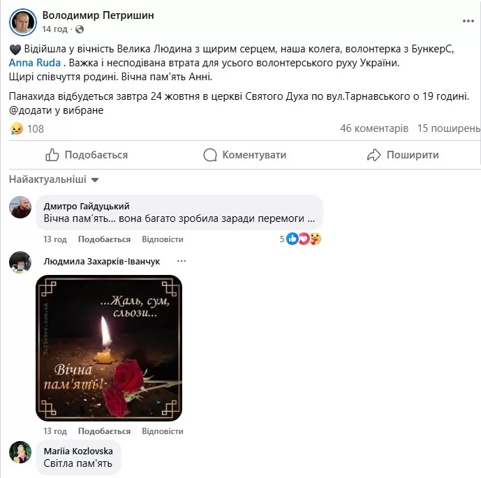 Редакція “Терміново” висловлює співчуття усім, хто знав Анну Руду. Вічна їй пам’ять.