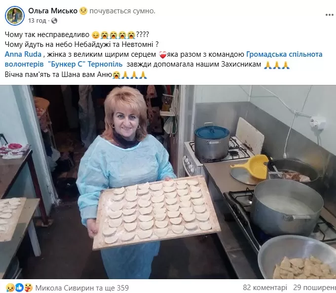 У Тернополі пішла з життя Анна Руда – жінка, яка створила волонтерську кухню "Бункер-С" і допомагала українським захисникам. Про смерть волонтерки написав у фейсбуці міський голова Тернополя Сергій Надал. Він назвав це великою втратою для міста і всього волонтерського руху в Україні. "Людина з великим серцем, яка присвятила своє життя служінню Україні та її захисникам. Вона вміла об'єднувати людей і надихати на безкорисливу допомогу", – написав Надал. Анна Руда заснувала волонтерську кухню "Бункер-С", яка готувала їжу для військових. Вона змогла згуртувати навколо себе багато людей, які теж займалися волонтерством. Редакція "Терміново" висловлює співчуття усім, хто знав Анну Руду. Вічна їй пам'ять.