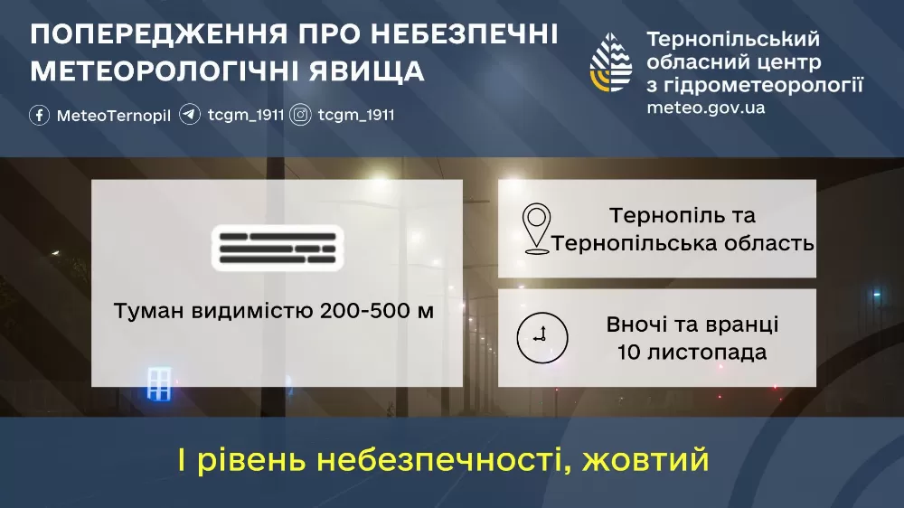 Мешканців Тернопілля попереджають про небезпечні погодні явища. Про це повідомляє Тернопільський обласний центр з гідрометеорології. "Область: Хмарно. Без істотних опадів. Вночі та вранці туман. Вітер південно-західний, 3 – 8 м/с. Температура вночі 3 – 8° тепла, вдень 7 – 12° тепла. Місто: Хмарно. Без істотних опадів. Вночі та вранці туман. Вітер південно-західний, 3 – 8 м/с. Температура вночі 5 – 7° тепла, вдень 10 – 12° тепла. Попередження про метеорологічні явища: Область, місто: Вночі та вранці 10 листопада очікується туман видимістю 200 – 500 м. Рівень небезпечності – жовтий (НМЯ I).🟡 11 листопада: Хмарно. Без істотних опадів. Вітер північно-західний, 5 – 10 м/с. Температура вночі 2 – 7° тепла, вдень 5 – 10° тепла. 12 листопада: Хмарно. Невеликі дощі. Вітер північно-західний, 5 – 10 м/с. Температура впродовж доби 4 – 9° тепла", - попереджають синоптики.