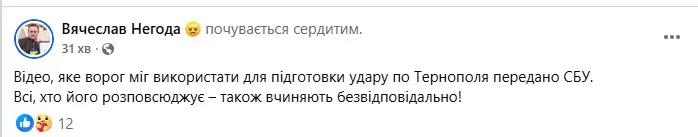 Відео, яке ворог міг використати для підготовки удару по Тернополю, передано СБУ. Про це повідомив начальник ОВА В’ячеслав Негода.