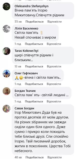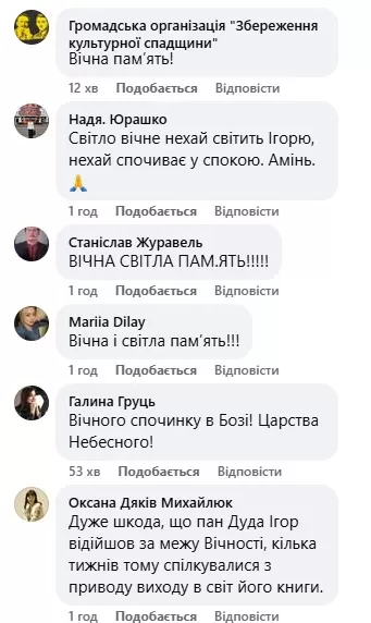 У коментарях під дописом – численні співчуття рідним та спогади про неоціненний вклад Ігоря Дуди у нашу культуру.