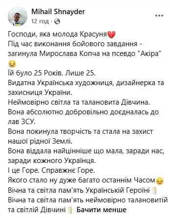 “Дуже важко підібрати слова. До таких втрат неможливо бути готовим. Вони були світлими та щирими Людьми. Гідними Українцями. Тими, хто робив світ навколо себе кращим навіть у найтемніші дні. Промінь. Акіра. Для нас велика честь служити з вами в одному строю. Ми продовжимо вашу роботу. Ми помстимось”, – йдеться у повідомленні.
