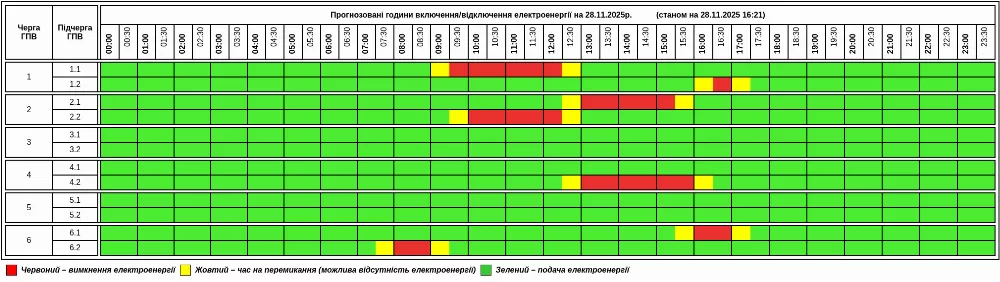 Опубліковано графік вимкнення світла на 29 листопада. Ним поділилися фахівці з "Тернопільобленерго". Актуальні графіки опубліковані на сайті обленерго. "Згідно вказівки НЕК "Укренерго" 29.11.2025 на території Тернопільської області діятиме Графік погодинних відключень (ГПВ)", - кажуть енергетики. 29 листопада по всій Україні діятимуть графіки відключень світла, — обленерго. ⭕️ Погодинні вимкнення: 00:00–23:59 — від 0,5 до 2,5 черг. ⭕️ Обмеження потужності для промисловості: 00:00–23:59.