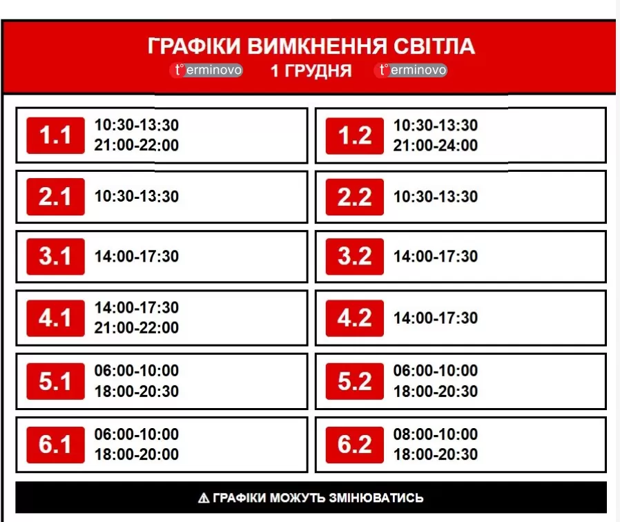 В АТ "Тернопільобленерго" опублікували графіки вимкнення світла на Тернопільщині на 1 грудня. Відповідний графік розміщено на сайті обленерго. Як видно з графіка, вимикатимуть одразу три-чотири підгрупи споживачів. "Повідомляємо, що графік протягом доби може змінюватися. Просимо слідкувати за оновленнями на нашому офіційному сайті", - йдеться у повідомленні. "Терміново" сформувало графіки в зручну інфографіку. Зберігайте та діліться з друзями.