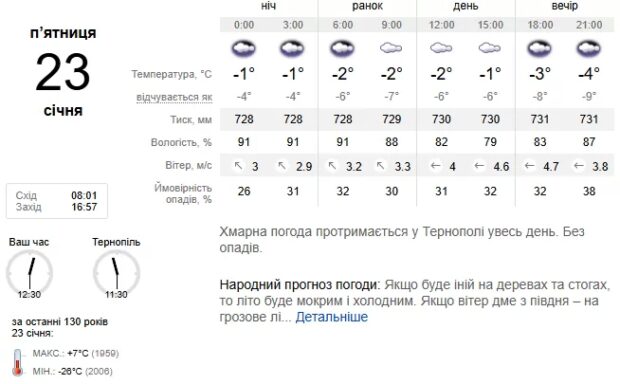 23 січня погода буде хмарною: вночі істотних опадів не очікується, проте вранці та вдень прогнозують невеликий сніг. Температура повітря коливатиметься від 0 до 5° морозу по області, а в Тернополі становитиме 1–3° нижче нуля. Через ожеледицю на дорогах оголошено жовтий рівень небезпечності. Про це повідомили в Тернопільському обласному центрі з гідрометеорології.