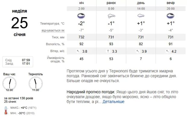 У неділю, 25 січня, опади часом триватимуть лише в нічний період, тоді як день пройде переважно без суттєвого снігу. Температурний режим дещо стабілізується в межах 0–5° морозу впродовж доби. Попри зменшення кількості опадів, ожеледиця на дорогах області залишатиметься.