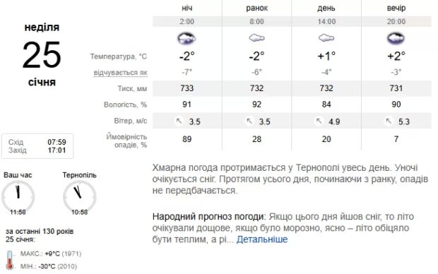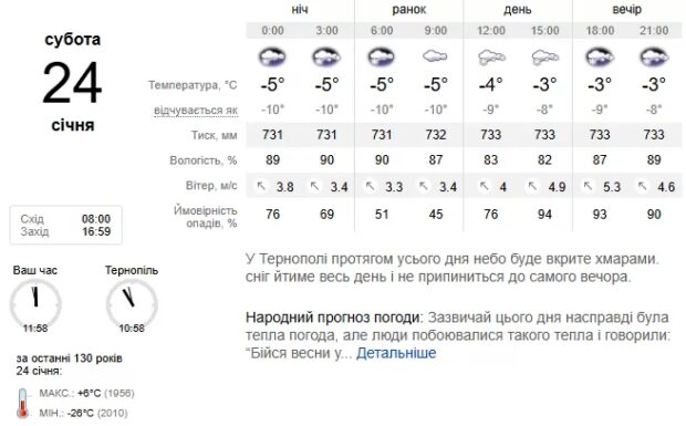 24 січня погода залишатиметься хмарною: якщо вночі очікуються лише невеликі опади, то вдень сніжитиме значно інтенсивніше. Температурні показники коливатимуться від 3 до 8° морозу вночі, а вдень становитимуть 0–5° нижче нуля. У самому Тернополі ніч буде досить холодною — до 8° морозу, проте вдень стовпчики термометрів піднімуться до позначки -1…-3°. Про це повідомили у Тернопільському обласному центрі з гідрометеорології.