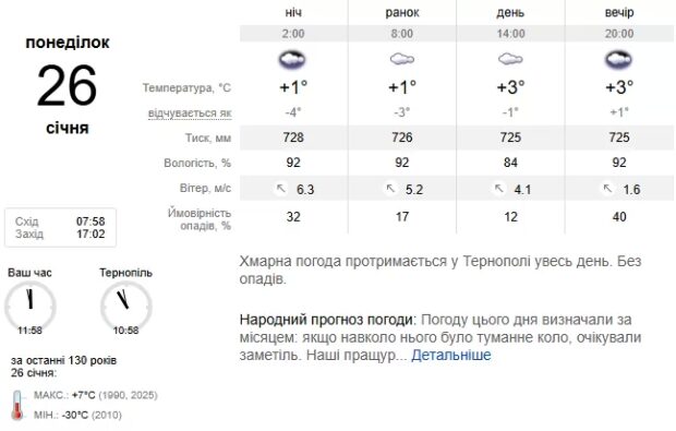 26 січня принесе остаточну зміну погодних умов у бік «європейської зими». Істотних опадів не прогнозують. Проте посилиться південно-східний вітер, пориви якого сягатимуть 7–12 м/с. Температурний фон протягом доби стабілізується в межах від 2° морозу до 3° тепла.