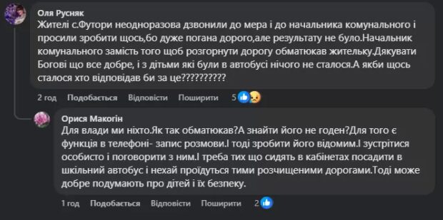 Зараз громада вимагає від посадовців негайно привести дорогу до ладу, наголошуючи, що нерозчищений автошлях — це пряма загроза життю дітей, а відповідальність за можливі трагедії ляже на плечі чиновників.