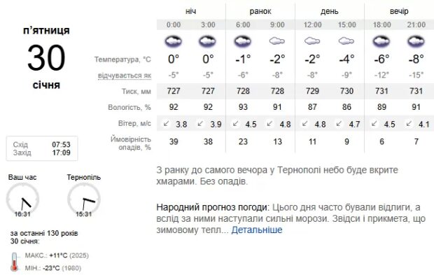 30 січня погода буде переважно хмарною. Вночі очікуються невеликі опади, а вдень — без істотних змін. На дорогах збережеться небезпечна ожеледиця, можлива слабка ожеледь. Про це повідомили у Тернопільському обласному центрі з гідрометеорології.