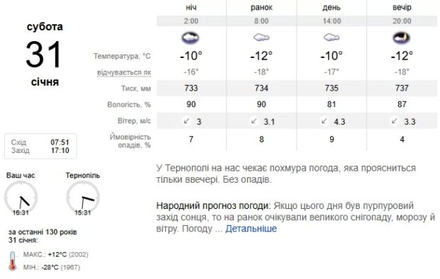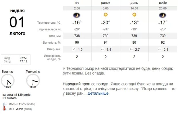У неділю, 1 лютого, очікується пік похолодання: вночі стовпчики термометрів покажуть від 16 до 21° морозу, а вдень температура триматиметься в межах 9-14° нижче нуля.