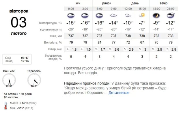 3 лютого на Тернопільщині очікується хмарна погода з періодичними проясненнями. Хоча суттєвих опадів не передбачається, мешканцям варто підготуватися до екстремальних температур: вночі стовпчики термометрів опустяться до 16–21° морозу, а вдень триматимуться в межах 7–12° нижче нуля. Синоптики Тернопільського обласного центру з гідрометеорології попереджають про ожеледицю на дорогах області та міста, через що оголошено жовтий рівень небезпечності.