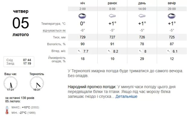 5 лютого на зміну лютим морозам прийде потепління, яке супроводжуватиметься штормовими поривами вітру. Температурні показники коливатимуться від 5° морозу вночі до 3° тепла вдень.