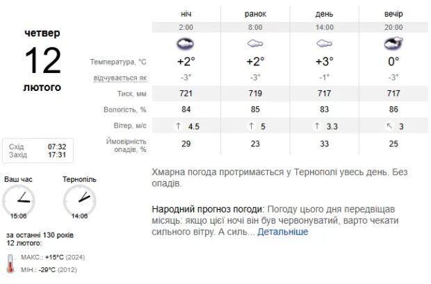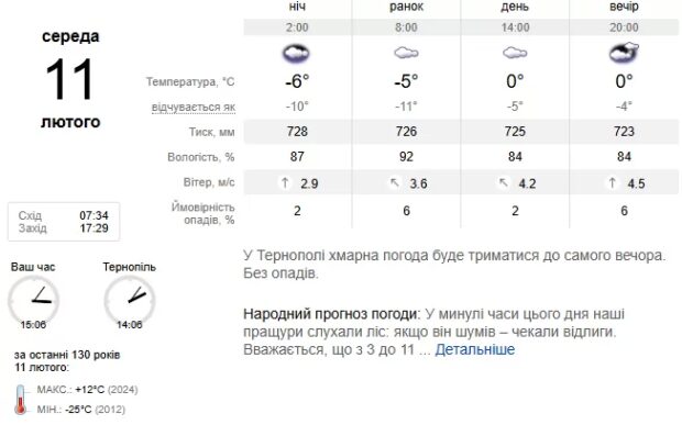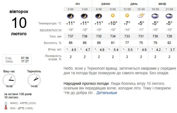У самому Тернополі нічна температура коливатиметься в межах 11–13 градусів морозу, вдень же буде трохи тепліше — від 3 до 5 градусів морозу. Протягом доби дутиме відчутний південно-східний вітер зі швидкістю 9–14 м/с.