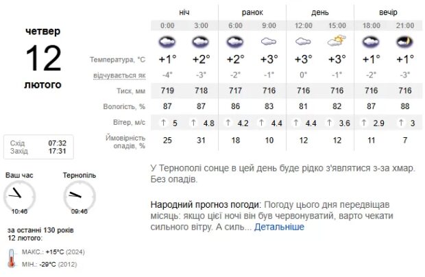 За даними сайту “Синоптик”, 12 лютого протягом усієї доби небо буде вкрите хмарами. Температура повітря коливатиметься у вузькому діапазоні: від +1°C вночі до +3°C у денні години. Через вологість понад 80% та помірний вітер відчуватиметься прохолодніше — як 0°…-4°C. Атмосферний тиск поступово знижуватиметься до 716 мм рт. ст.