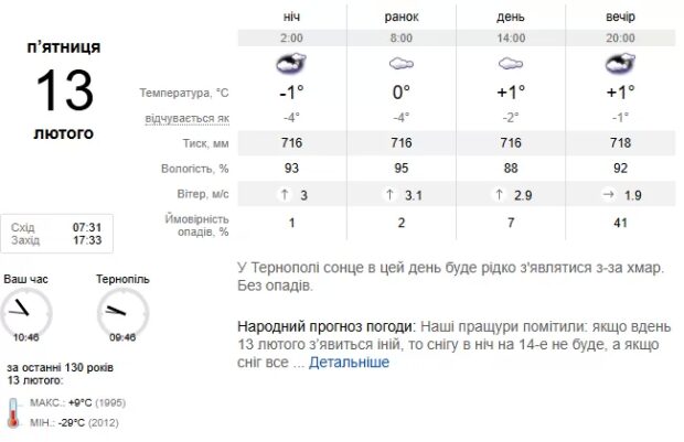 13 лютого характер погоди залишиться незмінним. Сонце рідко з’являтиметься з-за хмар, проте істотних опадів синоптики не прогнозують. Нічна температура триматиметься на позначці -1°C, а вдень стовпчики термометрів піднімуться лише до +1°C. Вологість повітря зросте до 95% у ранкові години, що може сприяти утворенню туману.