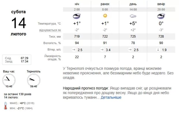 14 лютого очікується незначне підвищення температури вдень. Хоча погода залишатиметься похмурою, вранці можливе коротке прояснення. Ніч пройде з температурою +1°C, а вдень повітря прогріється до +5°C. На вечір знову похолодає до 0°C. Опадів у цей день також не передбачається, а атмосферний тиск почне стрімко зростати, досягнувши 728 мм рт. ст.