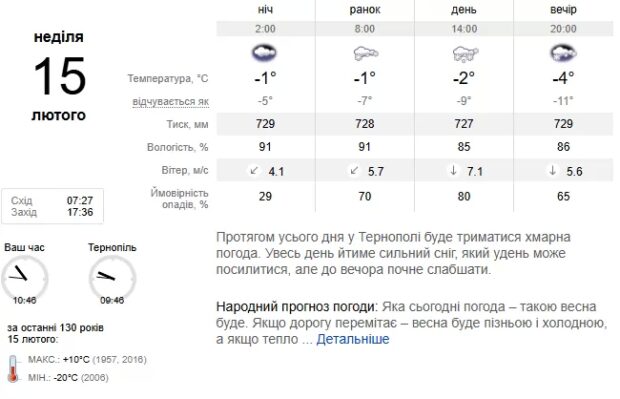 Проте вже з неділі, 15 лютого, метеорологічна ситуація різко погіршиться. Весь день у місті триматиметься хмарна погода, а регіон накриє потужний циклон. Синоптики прогнозують сильний сніг, який протягом дня може лише посилюватися. Разом із опадами прийде і суттєве похолодання: якщо вночі температура становитиме близько -1°C, то до вечора вона впаде до -4°C, а через вологість та вітер відчуватиметься як люті -11°C.