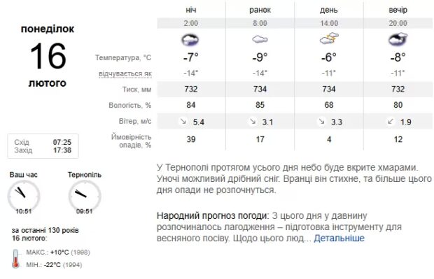16 лютого у нічні години очікується дрібний сніг, а температура повітря знизиться до -7…-9°C (відчуватиметься як -14°C). Вдень хмарність зберігатиметься, проте опади припиняться. Стовпчики термометрів показуватимуть близько 6 градусів морозу. Через різке зниження температури після відлиги на дорогах та тротуарах міста очікується сильна ожеледиця, тому водіям та пішоходам варто бути надзвичайно уважними.
