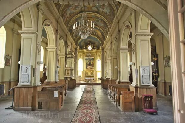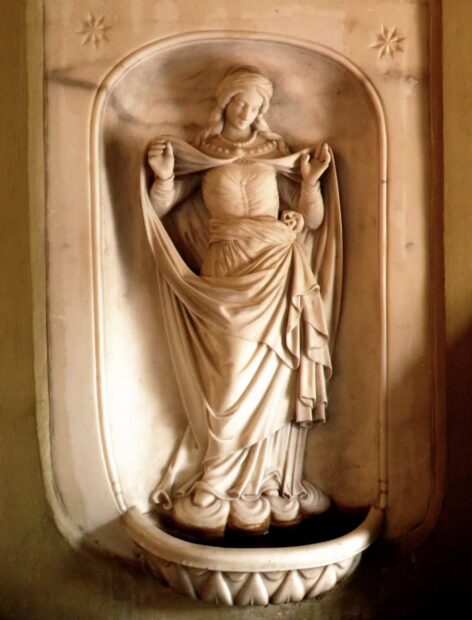 Зліва можна в храмі можна побачити витончений мармуровий асперсорій – чашу для освяченої води, з фігурою Діви Марії.