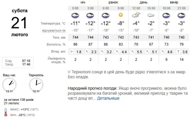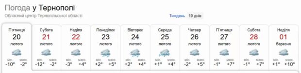 21 лютого буде малохмарна погода без опадів. У нічний та ранковий час можливий слабкий туман, а на дорогах зберігатиметься ожеледиця. Вночі по області температура опуститься до 9–14° морозу, у Тернополі — до 10–12° нижче нуля. Про це повідомили в Тернопільському обласному центрі з гідрометеорології.
