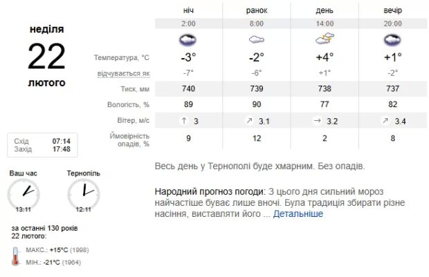 22 лютого небо затягнеться хмарами, хоча суттєвих опадів не передбачається. Вночі очікується лише 1–6° нижче нуля, а вдень повітря прогріється до 0–5° тепла.