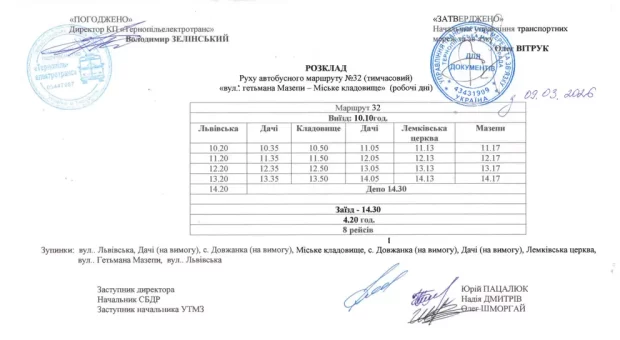 У Тернополі знову починає курсувати щоденний автобусний маршрут №32. З 9 березня автобус, що сполучає вулицю Івана Мазепи з міським кладовищем, повертається до регулярної роботи. Про це повідомили в Тернопільській міській раді. Транспорт за цим напрямком курсуватиме у будні дні та забезпечить стале сполучення для мешканців міста. Повний оновлений розклад та детальний графік руху вже доступні для перегляду на офіційному вебпорталі Тернопільської міської ради. "Також відстежити рух громадського транспорту в реальному часі можна у застосунку "е-Тернопіль" в розділі "Де Транспорт". Додаток можна завантажити на телефони на Android та на iOS", - йдеться у повідомленні.
