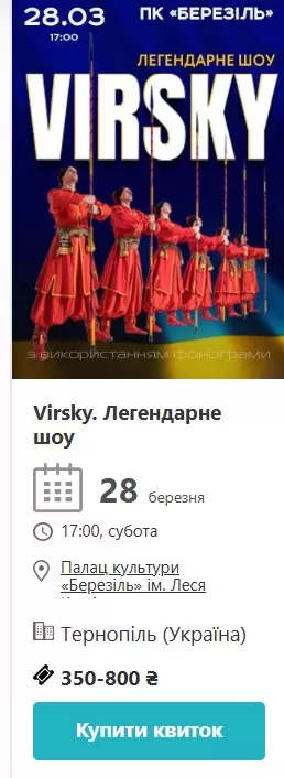 Через тиждень, 28 березня, Тернопіль концерти отримує одразу два. У Палаці культури «Березіль» імені Леся Курбаса о 17:00 виступить ансамбль Virsky – колектив, якому вже понад 90 років, і який давно став символом українського танцювального мистецтва. Це не просто концерт, це шоу з костюмами, хореографією і духом, який важко передати словами. Квитки – від 350 до 800 гривень.
