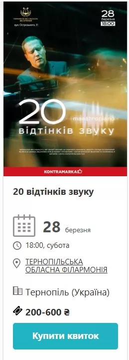 Того ж дня, але о 18:00 і в іншому місці – Тернопільська обласна філармонія запрошує на вечір «20 відтінків звуку». Це камерна програма, де класична музика подається інакше – живо, без зайвої офіційності. Вхід – від 200 гривень, що робить цей концерт одним із найдоступніших у списку.