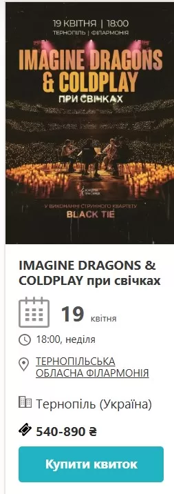 19 квітня о 18:00 у філармонії відбудеться вечір IMAGINE DRAGONS & COLDPLAY при свічках. Живе виконання хітів під живе світло свічок у концертній залі дає зовсім інше відчуття, ніж запис у навушниках. Квитки – від 540 до 890 гривень.