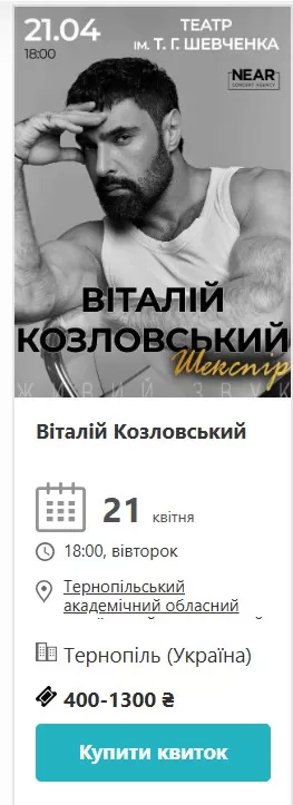 21 квітня на сцену Тернопільського академічного драматичного театру імені Шевченка виходить Віталій Козловський – співак, голос якого давно впізнають з перших нот. Початок о 18:00, квитки від 400 до 1300 гривень. Місця в перших рядах розходяться швидко.