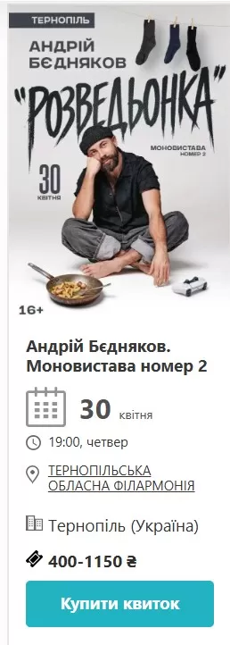 30 квітня там само Андрій Бєдняков привозить «Моновиставу номер 2». Квитки від 400 до 1150 гривень, початок о 19:00 у філармонії.