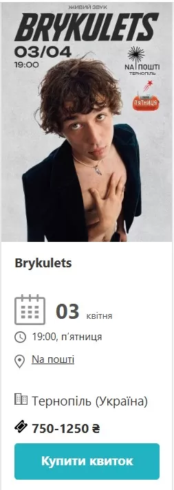 І ще одна подія квітня, яку варто виділити окремо. 3 квітня у клубі «На пошті» о 19:00 виступає Brykulets – молодий, але вже впізнаваний артист, який грає живу музику з характером. Квитки від 750 до 1250 гривень. Це не великий зал, а камерна атмосфера – і саме це робить такі концерти особливими.