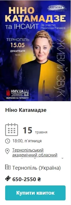 15 травня о 18:00 у драматичному театрі виступить Ніно Катамадзе – грузинська співачка з унікальним голосом, яка вже давно стала культовою фігурою для українського слухача. Квитки – від 650 до 2550 гривень, і це найдорожча подія з усього списку. Але ті, хто її чув живцем, кажуть, що це варте кожної гривні.