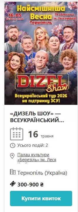 16 травня Палац культури «Березіль» прийматиме «Дизель Шоу» – всеукраїнський весняний тур 2026 року. Комедійне шоу, яке збирає повні зали вже не перший рік. Квитки від 300 до 900 гривень, і місця там точно не пустують.