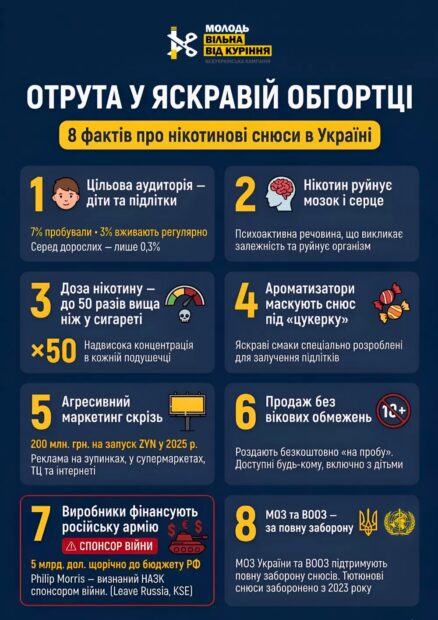 У 2025 році волонтери всеукраїнської кампанії «Молодь вільна від куріння» виявили в Тернополі понад два десятки об'єктів незаконної зовнішньої реклами нікотинових снюсів, серед яких були банери та постери в точках продажу. Після подання офіційних звернень до Держпродспоживслужби та їх розгляду вуличну рекламу цих засобів повністю демонтували. Про це повідомили в пресслужбі всеукраїнської кампанії “Молодь вільна від куріння”. Підприємці продовжують розміщувати промоційні матеріали на касах супермаркетів, в закладах харчування, торгівельних центрах та на АЗС. Згідно з офіційними даними Головного управління Держпродспоживслужби у Тернопільській області, минулого року було зафіксовано понад сорок порушень законодавства про рекламу, більшість із яких стосувалися саме нікотинових снюсів. За ці порушення на підприємців наклали штрафи на суму 134 тисячі гривень. Тенденція до посилення контролю зберігається і в поточному році, адже лише за перший квартал 2026 року кількість виявлених порушень сягнула позначки сорока випадків, а загальна сума штрафних санкцій […]