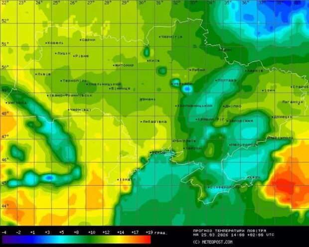 26 березня потепління посилиться. Небо залишатиметься хмарним із проясненнями, а суттєвих опадів не передбачається.