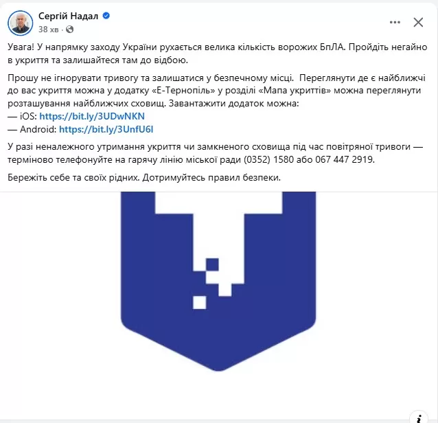 “Увага жителям Тернопільщини, зокрема міста Тернопіль. За попередньою інформацією в напрямку Тернополя рухається велика кількість ворожих БПЛА! Прошу всіх не ігнорувати сигнал «повітряна тривога»! При сигналі – негайно прямуйте в укриття!”, – написав Тарас Пастух.