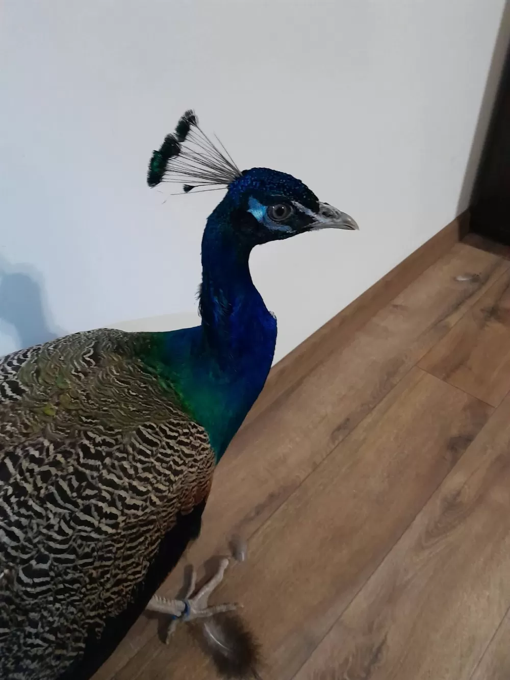 Павич зовсім не ручний і дуже боїться чужих людей, тому навряд чи сам піде на контакт. Ймовірно, він блукає поблизу чиїхось осель у пошуках знайомого місця.