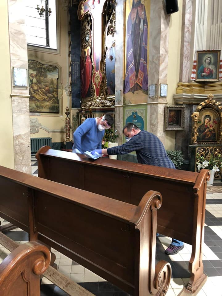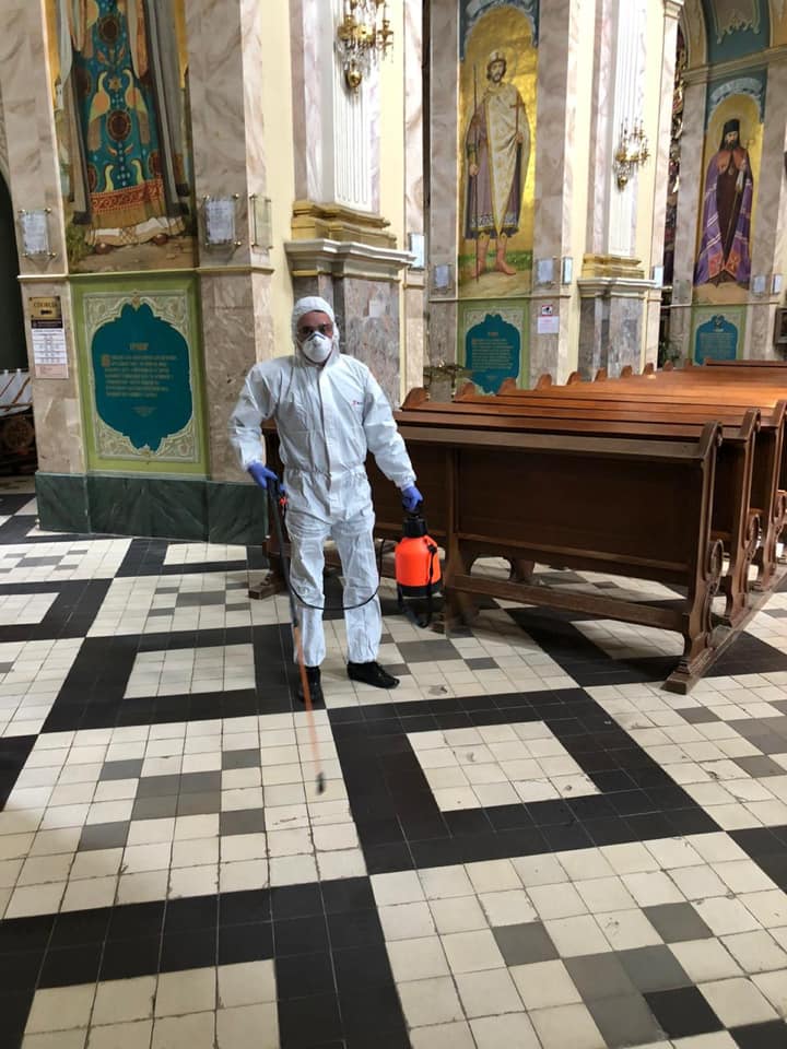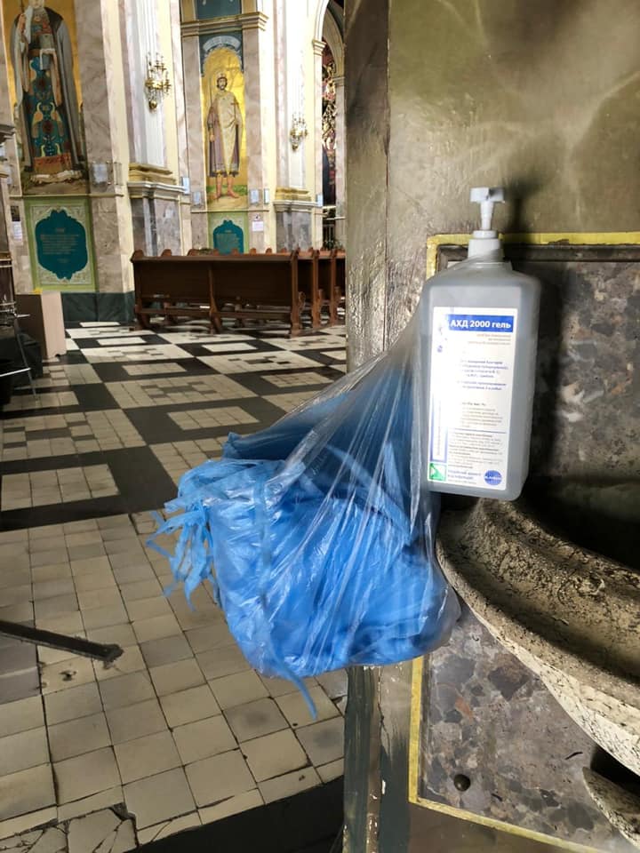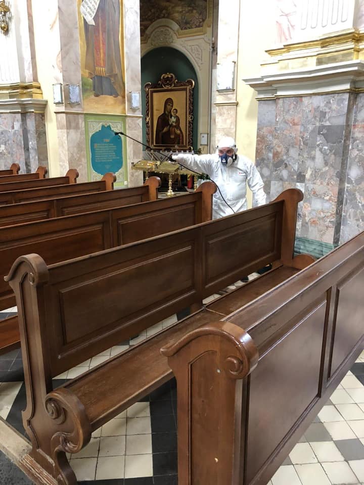 А напередодні богослужіння священнослужителі продезінфікували храм. Нагадаємо, з 22 травня вступили в дію нові норми етапу “адаптивного карантину”, які дозволяють проведення служб у храмах із розрахунку одна людина на 10 кв. м.