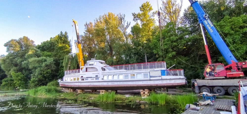 – Ми мали зробити все ще раніше, але у зв’язку із карантином і опадами, які тривали впродовж місяця, ми не могли витягнути теплохід на сушу, – розповідає Стасюк. – Земля досі не висохла. Крани дуже важкі, судно важить 40 т. Дістати його з води було майже нереально. Можна сказати, що його підйом – історична подія. Складність була у тому, що кран просто закопувався у землю. Ми робили і щити під нього на два метри квадратних, але він їх вижимав у землю, яка занадто волога.