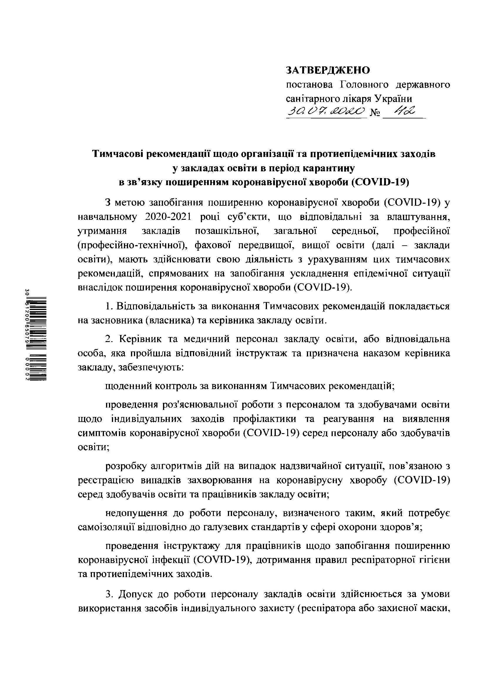 Головний санітарний лікар дав тимчасові рекомендації по навчанні на “період карантину в зв’язку поширенням коронавірусної хвороби (COVID-19)”. Постанову пресслужба структури передала виданню LIGA.net.