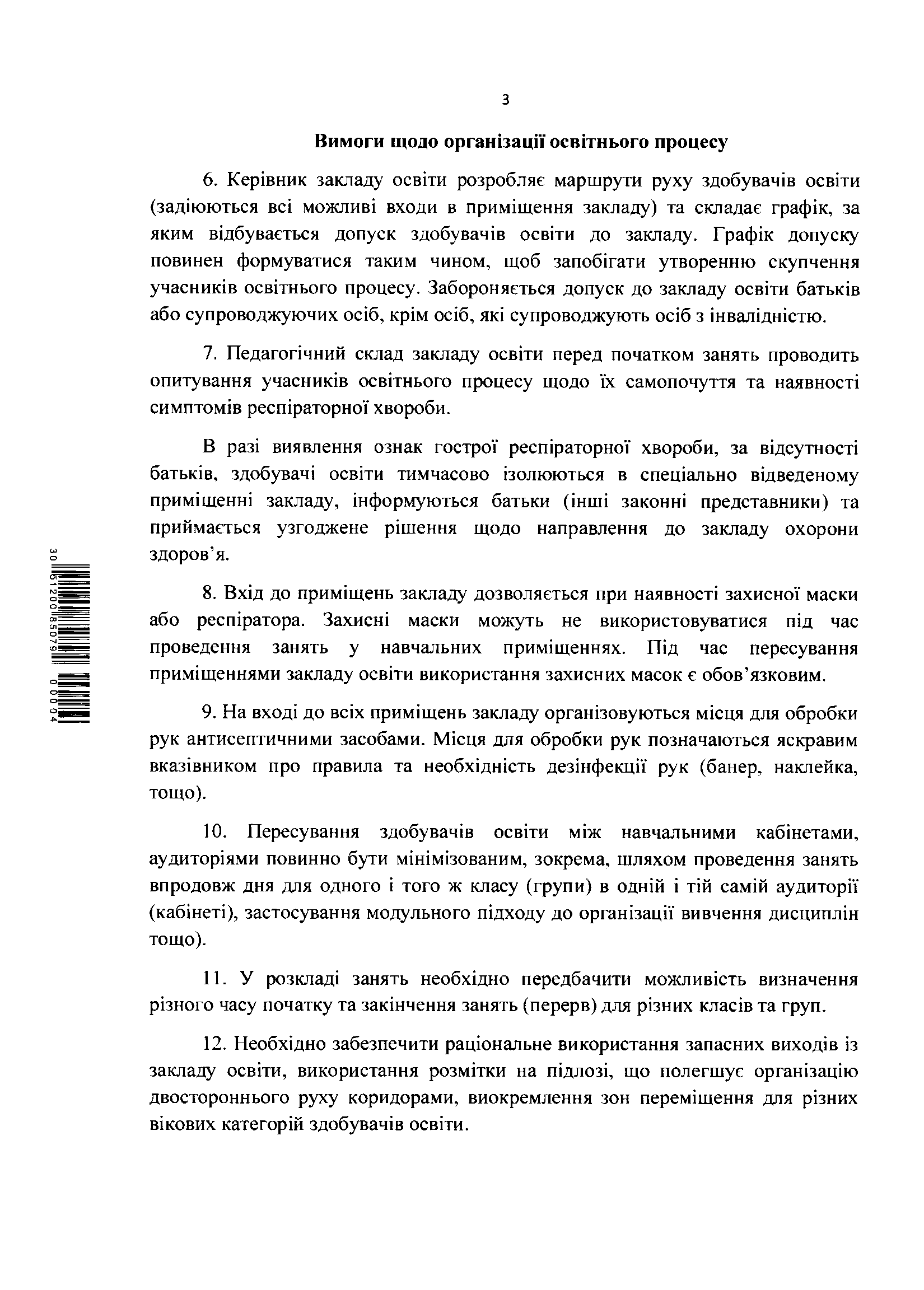 Загальні правила: заходити до садка, школи, училища, університету можна тільки у масці або респіраторі. Але їх можна не використовувати під час занять в приміщеннях. При виході до коридору маска вже обов’язкова. За рекомендаціями, всередину навчальних приміщень заборонено заходити батькам, виняток – супровід дітей з інвалідністю.